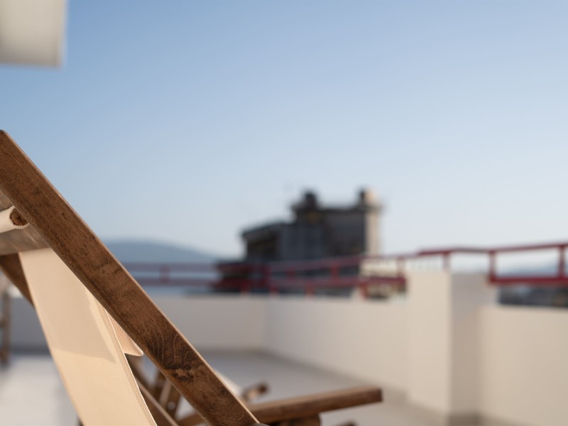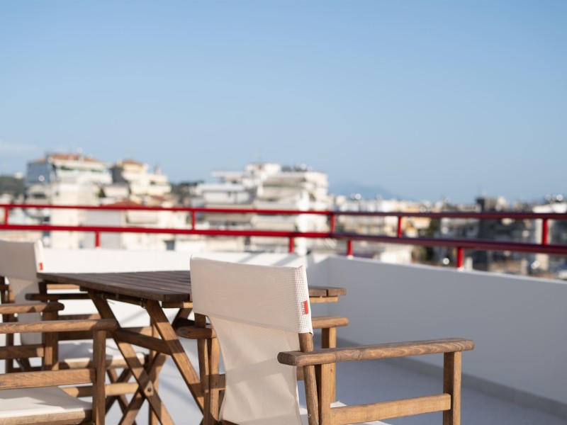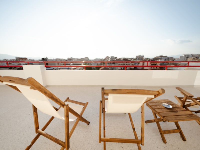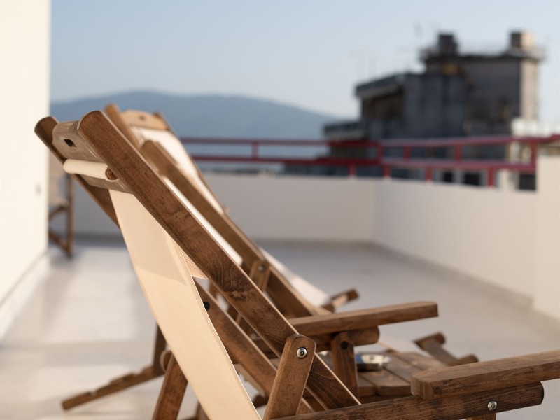 -The apartment has a large balcony with comfortable chairs and a unique view.