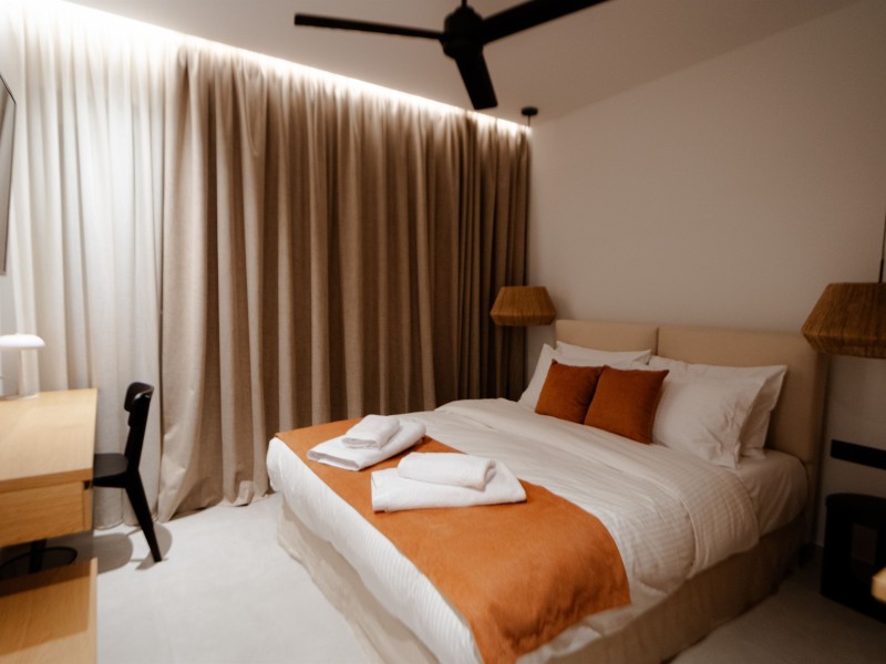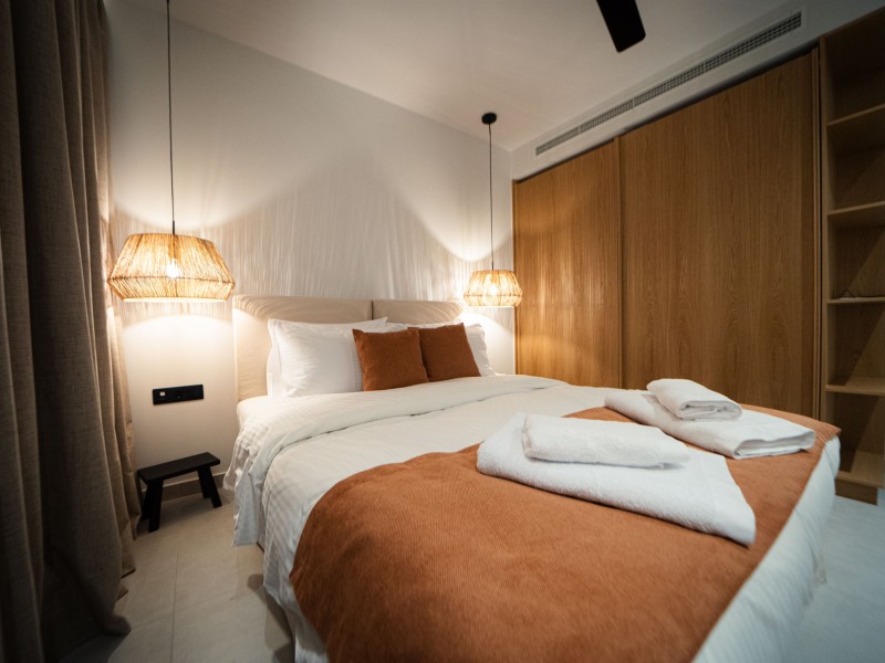 -The accommodation consists of a large bedroom with a super-double comfortable bed that has an anatomic mattress and COCO-MAT company pillows as well as a spacious wardrobe.