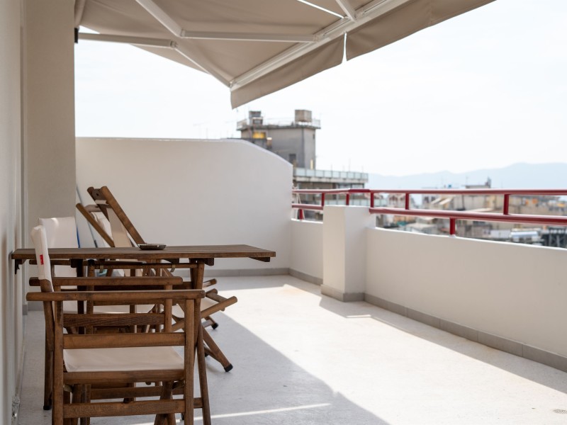 -The apartment has a large balcony with comfortable chairs and a unique view.